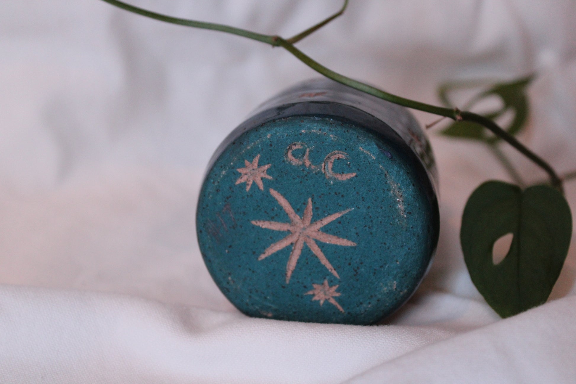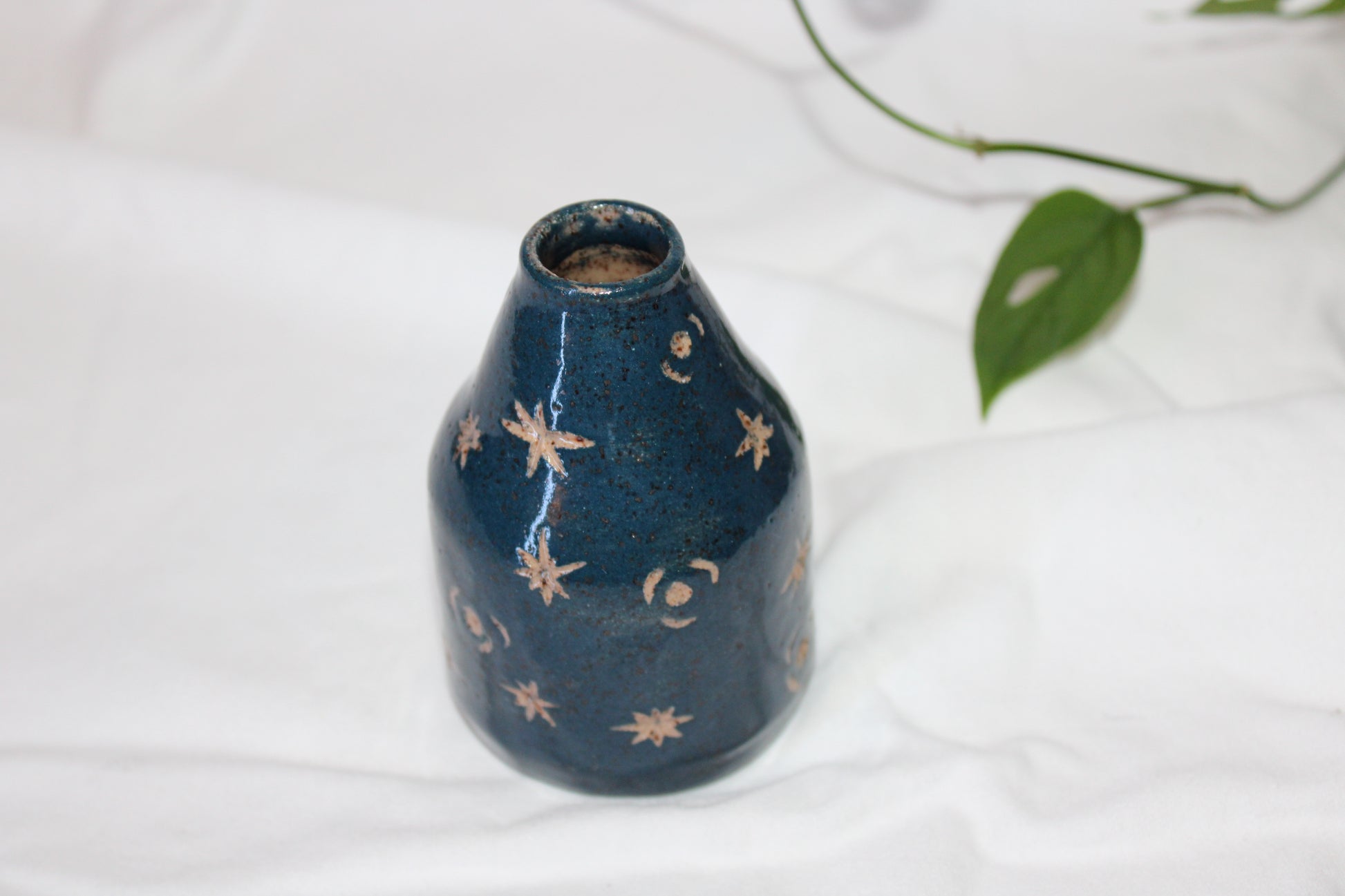 Sgraffito bud vase with starry design carved into dark blue underglaze and coated with a clear glaze. ~3.5" x 2.25"
